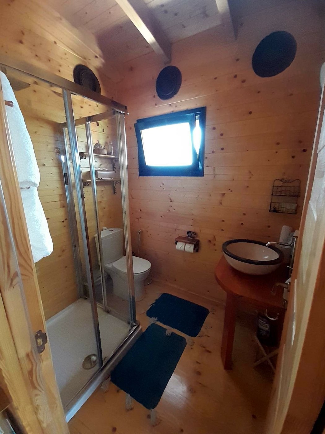 At The Lodge Corfu, the large walk-in shower with glass sliding doors and warm wood paneling creates a soothing, spa-like atmosphere, combining rustic charm with all the practical features expected of a contemporary bathroom.